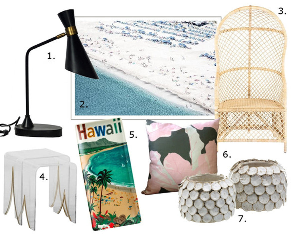 1. Iron Table Lamp \ 2. Beach View 2 \ 3. Rattan Dome Chair \ 4. Acrylic Nesting Tables \ 5. Hawaii Tray \ 6. Fig Leaf Pillow